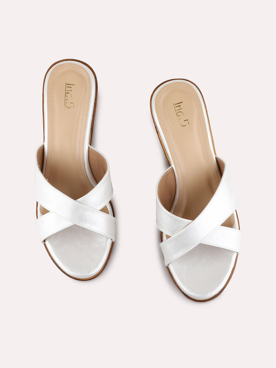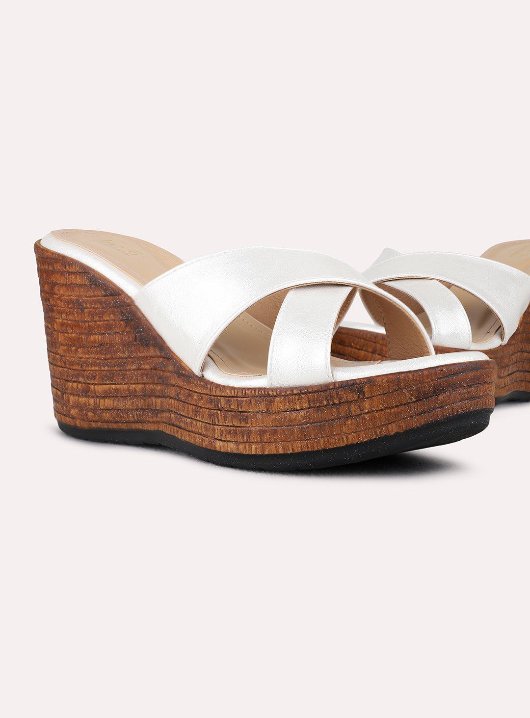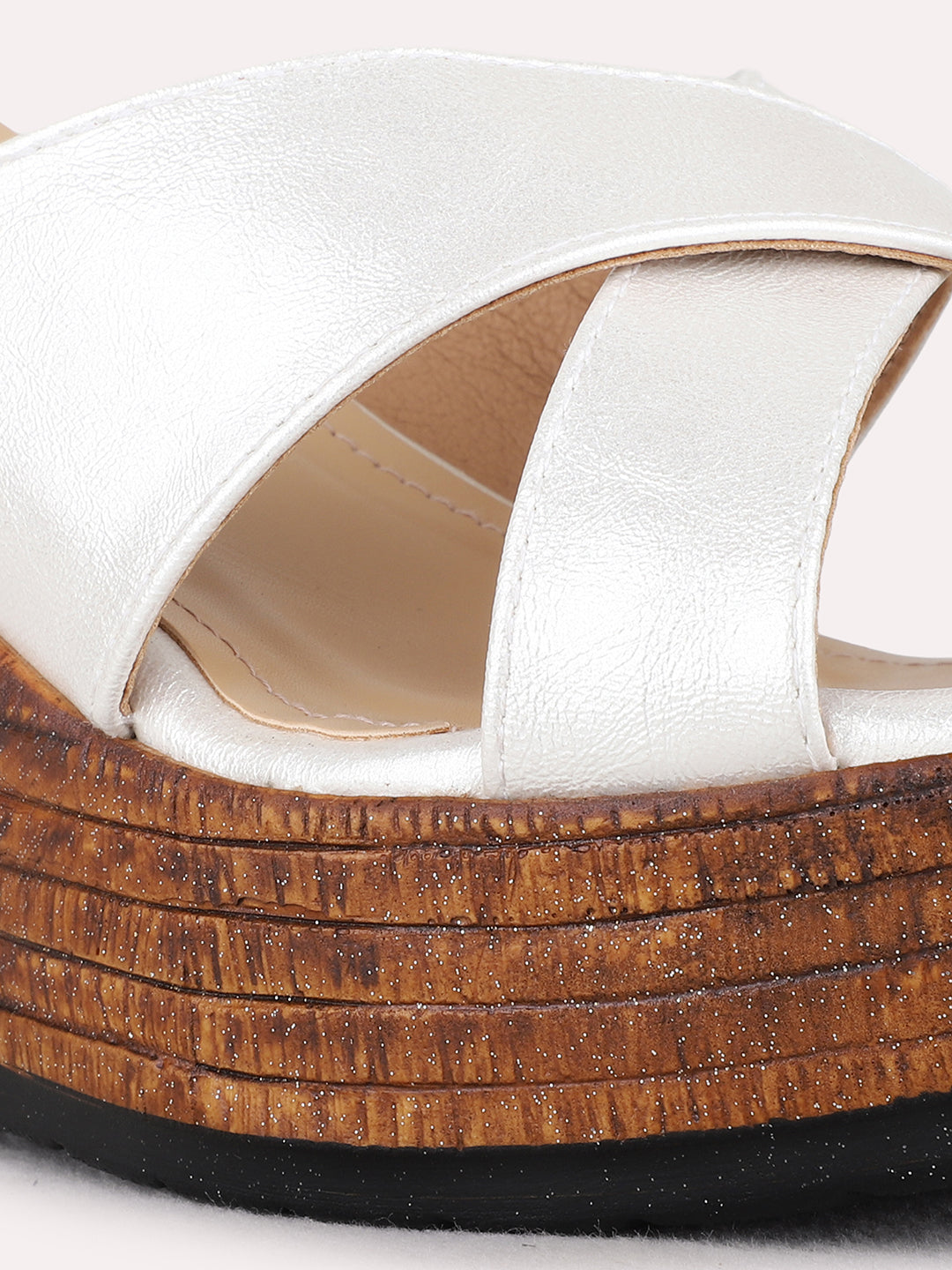 Womens Silver Party Wear Textured Round Toe Wedge Heel Sandals