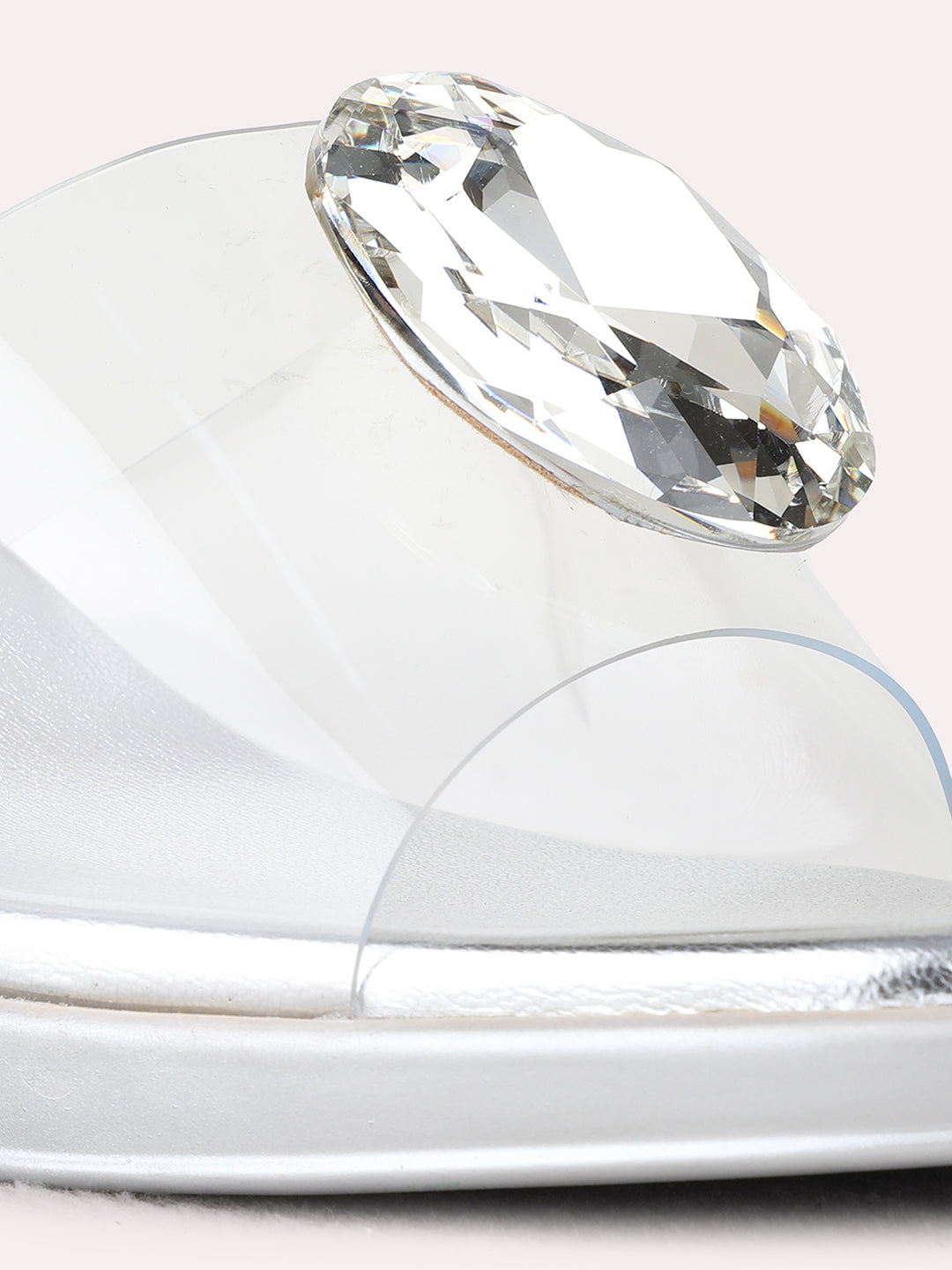 Womens Silver Party Wear Transparent Round Toe Block Heel Sandals