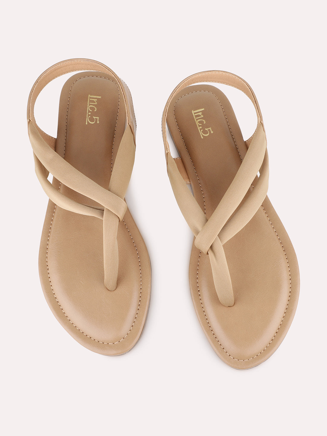 Womens Tan Casual Solid T-Strap Flat Sandals