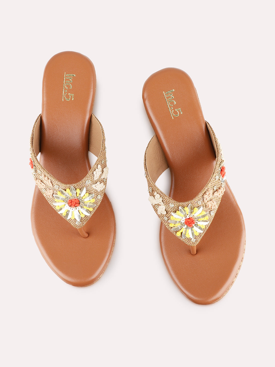 Product description:-Tan ethnic wedge heels with embellishments give a stylish and traditional look. Comfortable for festivals, family gatherings, or casual ethnic wear. |