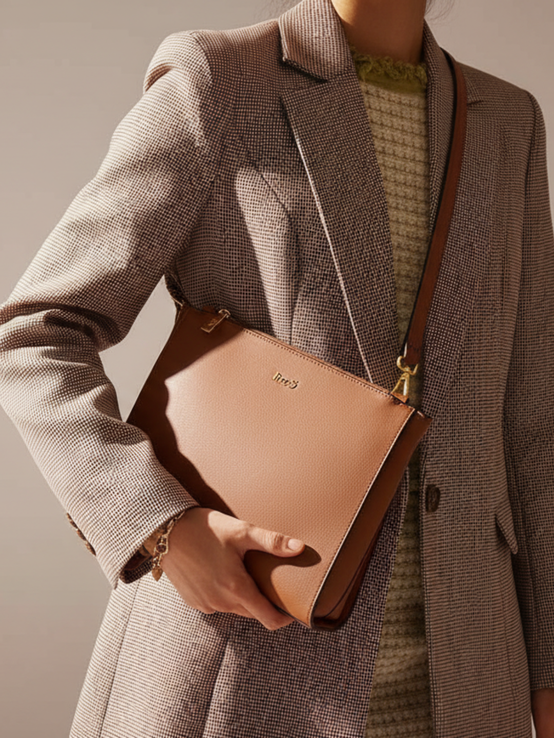 Womens Tan Shoulder Bag With Zip Lock For Casual